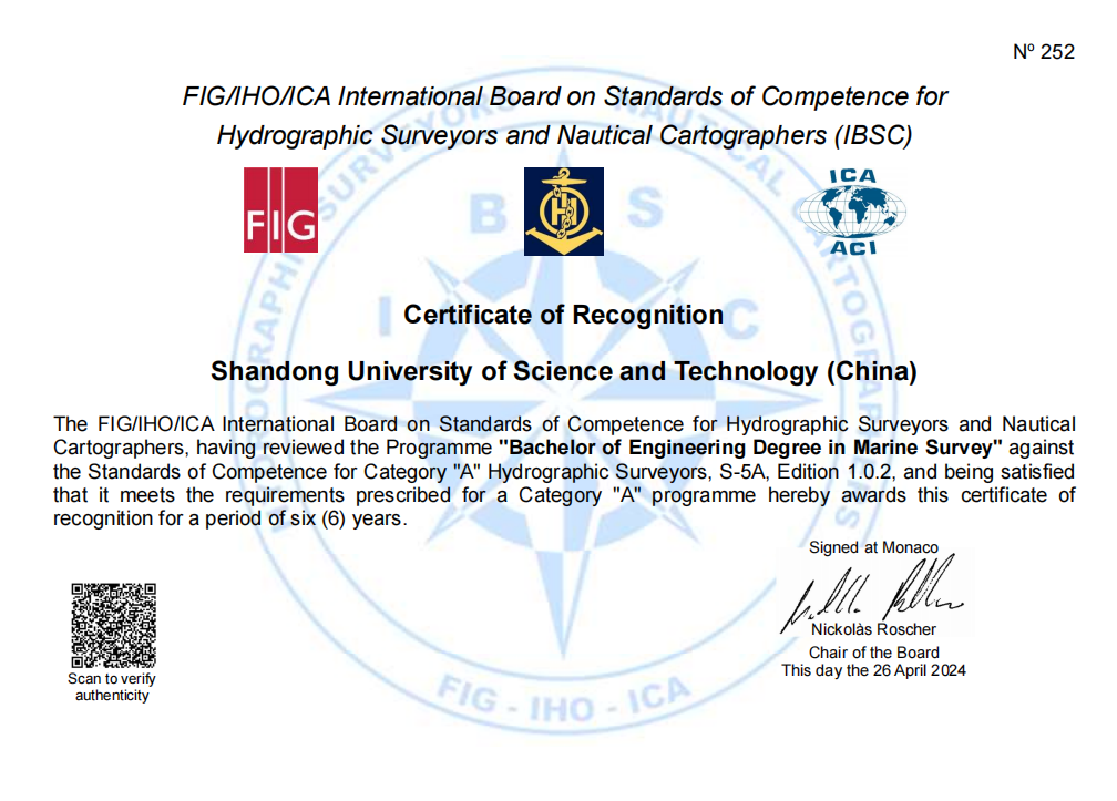 近日,由国际测量师联合会、国际海道测量组织和国际制图协会(FIG/IHO/ICA)联合组成的国际海道测量师和海图制图师能力标准委员会(IBSC)发来函告:山东科技大学测绘与空间信息学院“海洋测绘工程工学本科专业教学计划”获得国际A级认证。山东科技大学成为国内非军方高校唯一获得该资质的单位。
